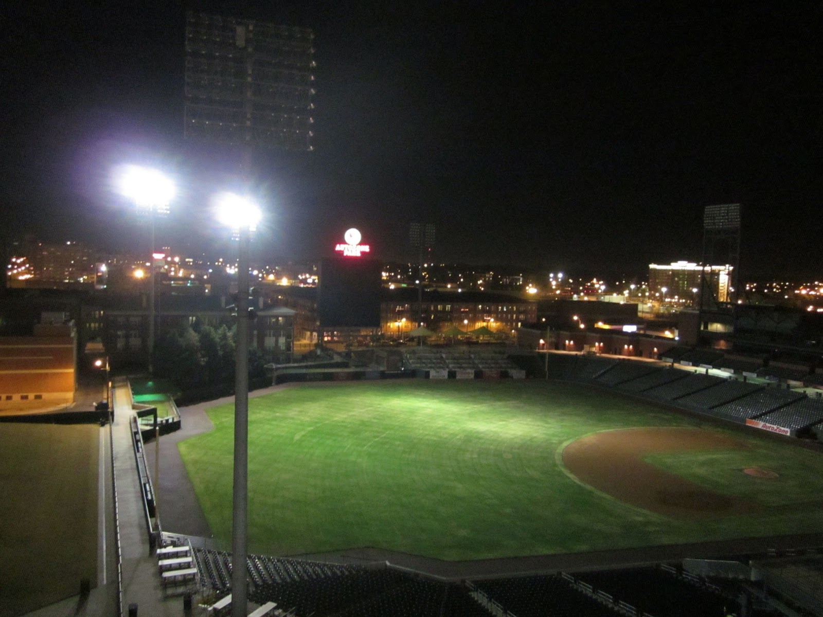 | Our view from the roof of the parking deck: Autozone Park and downtown lights |